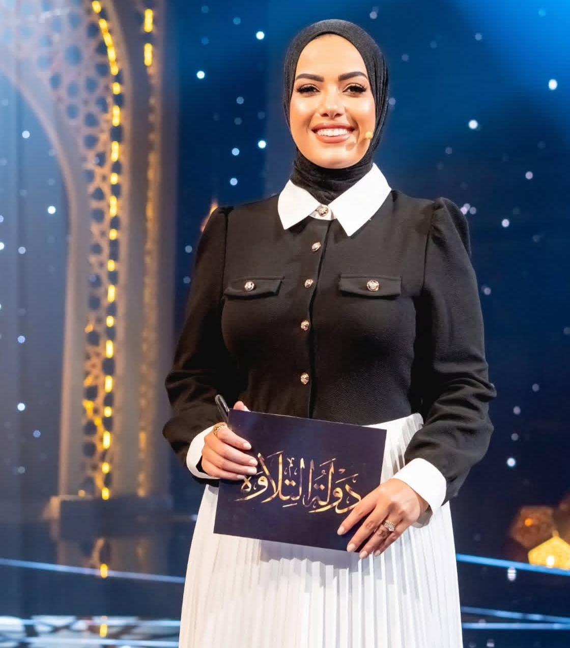 تألقت مقدمة برنامج دولة التلاوة آية عبد الرحمن خلال ظهورها منذ أولى الحلقات، فهي تتميز بأسلوب أنيق وعملي في اختيار ملابسها التي تجمع الوقار والبساطة.