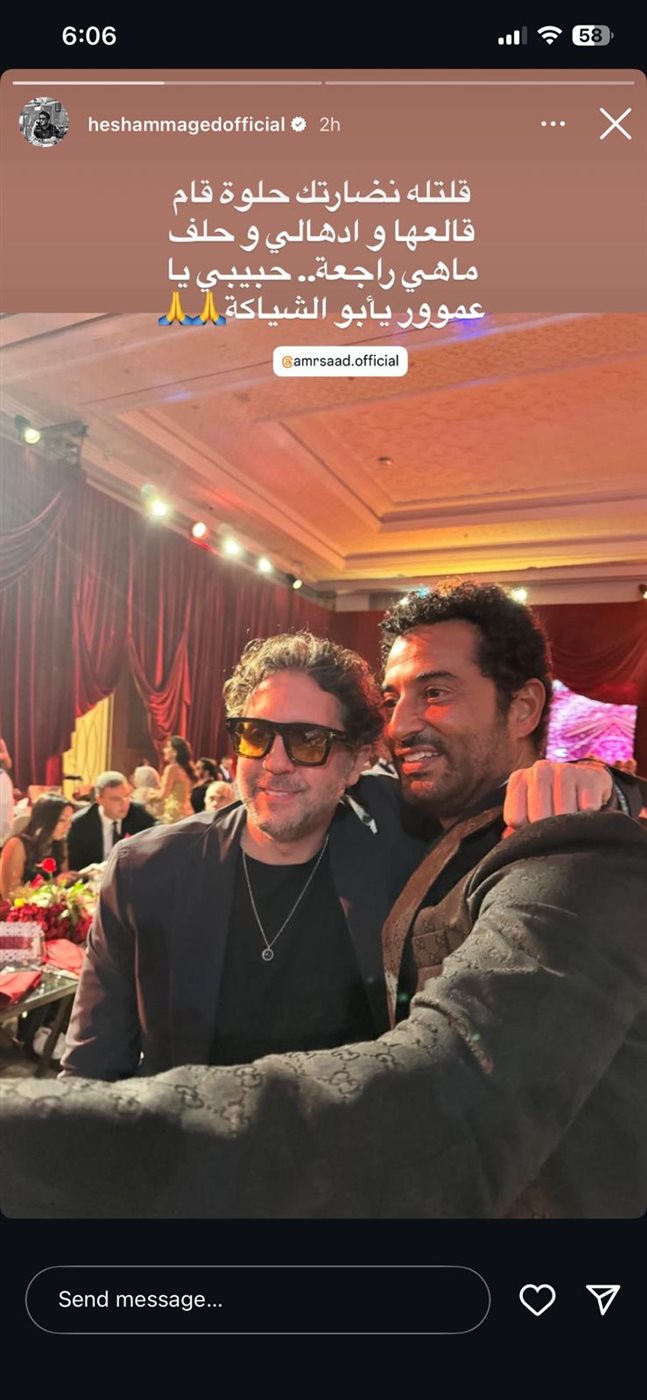 شارك الفنان هشام ماجد جمهوره صورة تجمعه بالفنان عمرو سعد عبر خاصية “الاستوري” على حسابه بموقع إنستجرام، حيث ظهر خلالها وهو يرتدي نظارة الأخير.