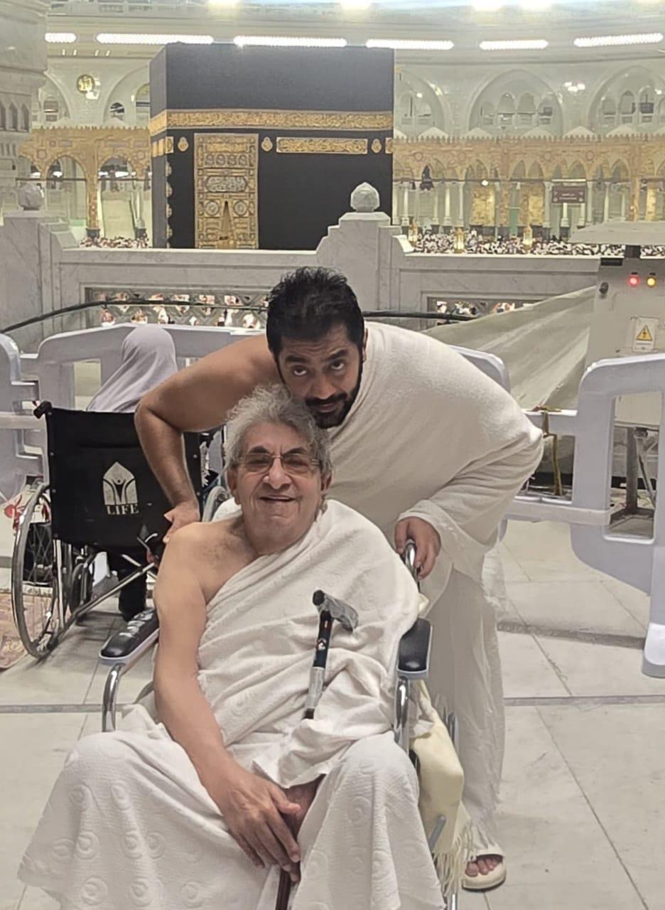 على كرسي متحرك.. أحمد فلوكس يصطحب والده فاروق فلوكس لأداء مناسك العمرة
