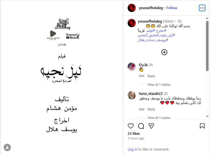 أعلن يوسف نجل حمادة هلال عن توليه مهمة إخراج فيلم جديد يحمل عنوان ليلة نجية، وسوف يبدأ تصوير هذا الفيلم قريبًا، حيث نشر صورة للأسكريبت عبر حسابه الرسمي على موقع تبادل الصور والفيديوهات إنستجرام، وقال يوسف حمادة هلال معلقًا: “بسم الله توكلنا على الله، مخرج فيلم ليلة نجية قريبًا”.