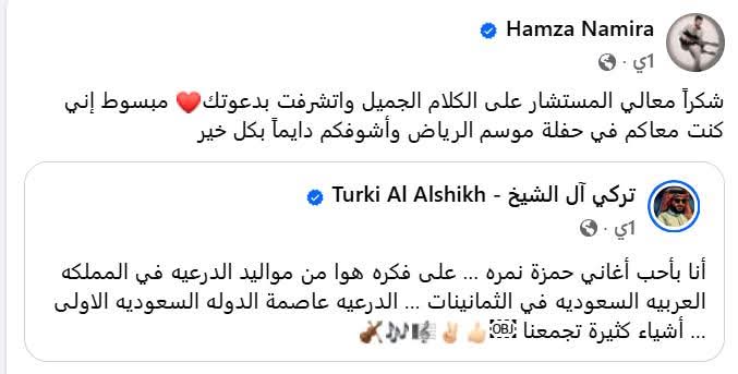 ليعيد حمزة نمرة نشر تلك المنشور عبر حسابه الرسمي على موقع التواصل الإجتماعي فيسبوك، وقال فيه: “شكرًا معالي المستشار على الكلام الجميل واتشرفت بدعوتك، مبسوط إني كنت معاكم في حفلة موسم الرياض، وأشوفكم دايمًا بكل خير”.