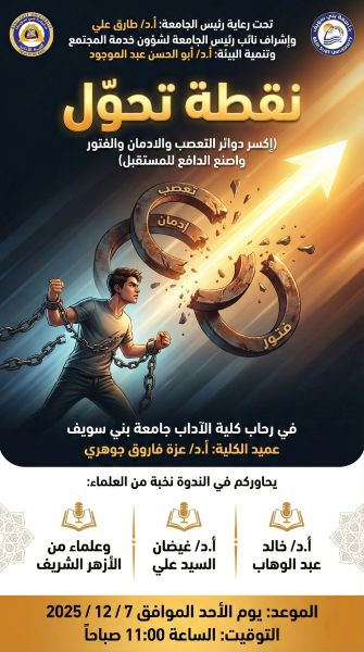 نظمت كلية الآداب بجامعة بنى سويف ندوة بعنوان " نقطة تحوّل" وذلك تحت رعاية الدكتور طارق على القائم بأعمال رئيس الجامعة وتحت إشراف الدكتور أبو الحسن عبد الموجود، نائب رئيس الجامعة لشؤون خدمة المجتمع وتنمية البيئة، والدكتورة عزة جوهري، عميد كلية الآداب، جاء ذلك بحضور نخبة مميزة من العلماء والمتخصصين، وعلماء الأزهر الشريف.
