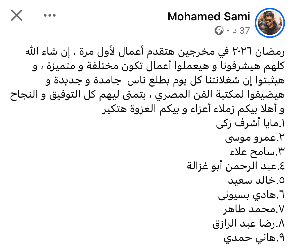 وكتب محمد سامي عبر صفحته الرسمية على موقع التواصل الإجتماعي فيس بوك : رمضان 2026 في مخرجين هتقدم أعمالا لأول مرة، إن شاء الله كلهم هيشرفونا وهيعملوا أعمالا تكون مختلفة ومتميزة، وهيثبتوا إن شغلانتنا كل يوم بطلع ناس جامدة وجديدة وهيضيفوا لمكتبة الفن المصري .