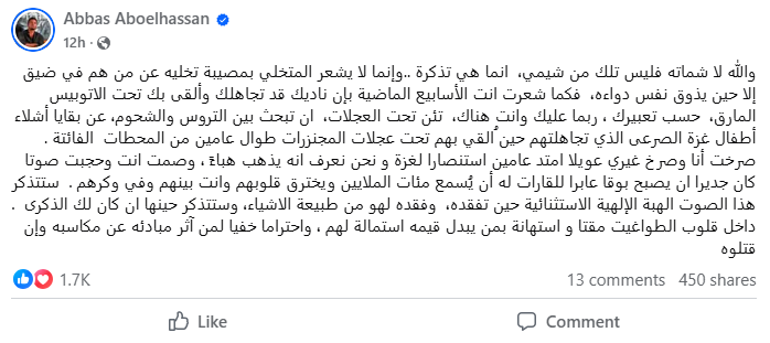 وقال أبو الحسن، في منشور له عبر حسابه الرسمي على موقع التواصل الاجتماعي "فيس بوك"، إن الشماتة ليست من طباعه لكنه يوجّه "تذكرة" لمن "تخلّى عن من هم في ضيق"، مؤكدًا أن الإنسان لا يشعر بوقع تخليه إلا حين يتعرض للأمر نفسه. وأضاف قائلًا: "والله لا شماته فليس تلك من شيمي، إنما هي تذكرة.. وإنما لا يشعر المتخلي بمصيبة تخليه عن من هم في ضيق إلا حين يذوق نفس دواءه، فكما شعرت أنت الأسابيع الماضية بأن ناديك قد تجاهلك وألقى بك تحت الأوتوبيس المارق - حسب تعبيرك - ربما عليك وأنت هناك، تئن تحت العجلات، أن تبحث بين التروس والشحوم عن بقايا أشلاء أطفال غزة الذين تجاهلتهم حين أُلقي بهم تحت عجلات المجنزرات طوال عامين من المحطات الفائتة".