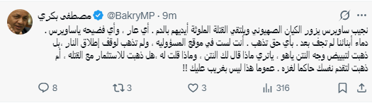 ويأتي هجوم بكري وسط حالة جدل واسعة أثارها تقرير صحيفة «هآرتس» العبرية، والذي زعمت فيه أن ساويرس زار تل أبيب الأسبوع الجاري بالتزامن مع تحركات دبلوماسية حول ترتيبات "اليوم التالي" للحرب في غزة.