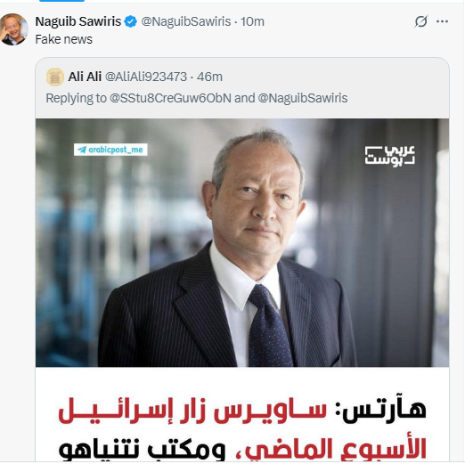 وكان نجيب ساويرس قد نفى بشكل قاطع هذه المزاعم في تغريدات سابقة، مؤكدًا أن الخبر "كاذب تمامًا" وأنه لم يزر تل أبيب في حياته.