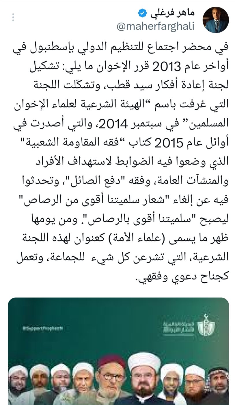 وقال فرغلي في تغريدة له عبر حسابه الرسمي على منصة "إكس"، إن محضر اجتماع للتنظيم الدولي في إسطنبول أواخر عام 2013 تضمن قرار تشكيل لجنة لإعادة أفكار سيد قطب، ليظهر لاحقًا ما عُرف بـ"الهيئة الشرعية لعلماء الإخوان المسلمين" في سبتمبر 2014، وهي الجهة التي أصدرت أوائل 2015 كتاب "فقه المقاومة الشعبية" واضعةً فيه ضوابط استهداف الأفراد والمنشآت وفق مفهوم "دفع الصائل".