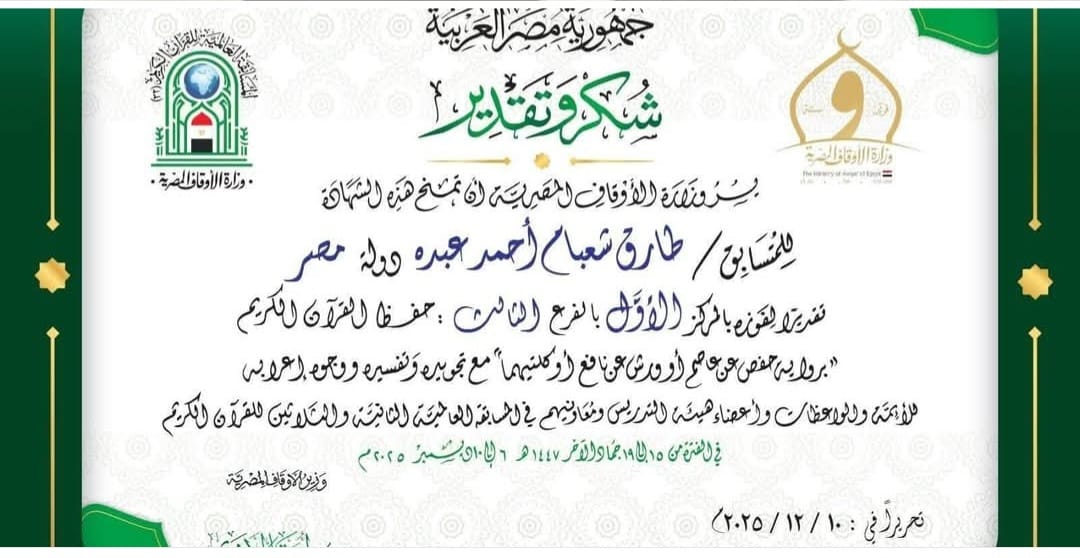 وأعربت مديرية أوقاف البحيرة عن سعادتها البالغة بهذا الإنجاز المشرف، الذي يعكس ثمرة الجد والاجتهاد، ويبرز مكانة أبناء المديرية في ميدان خدمة القرآن الكريم وعلومه.