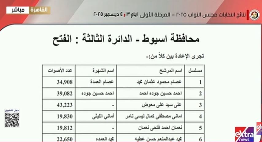 أعلن المستشار حازم بدوي رئيس الهيئة الوطنية للانتخابات، عن إجراء الإعادة بين 6 مرشحين في الدائرة الثالثة الفتح بمحافظة أسيوط.