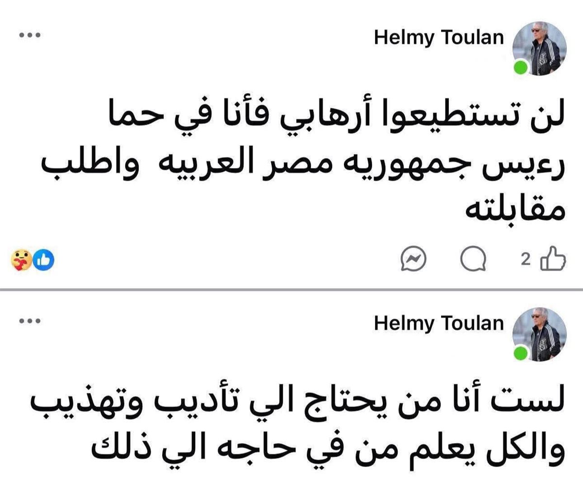 وعبر حلمي طولان عن غضبه من الانتقادات خلال حسابه الرسمي على موقع التواصل الاجتماعي فيس بوك “ لن تستطيعوا إرهابي فأنا في حمى رئيس الجمهورية واطلب مقابلته، لست أنا من يحتاج إلى تأديب وتهذيب والكل يعلم من في حاجة إلى ذلك".