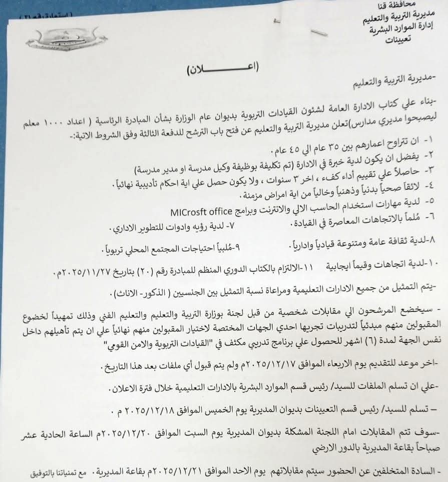 تعليم قنا: فتح باب الترشح لمبادرة "إعداد ألف معلم ليصبحوا مديري مدارس"