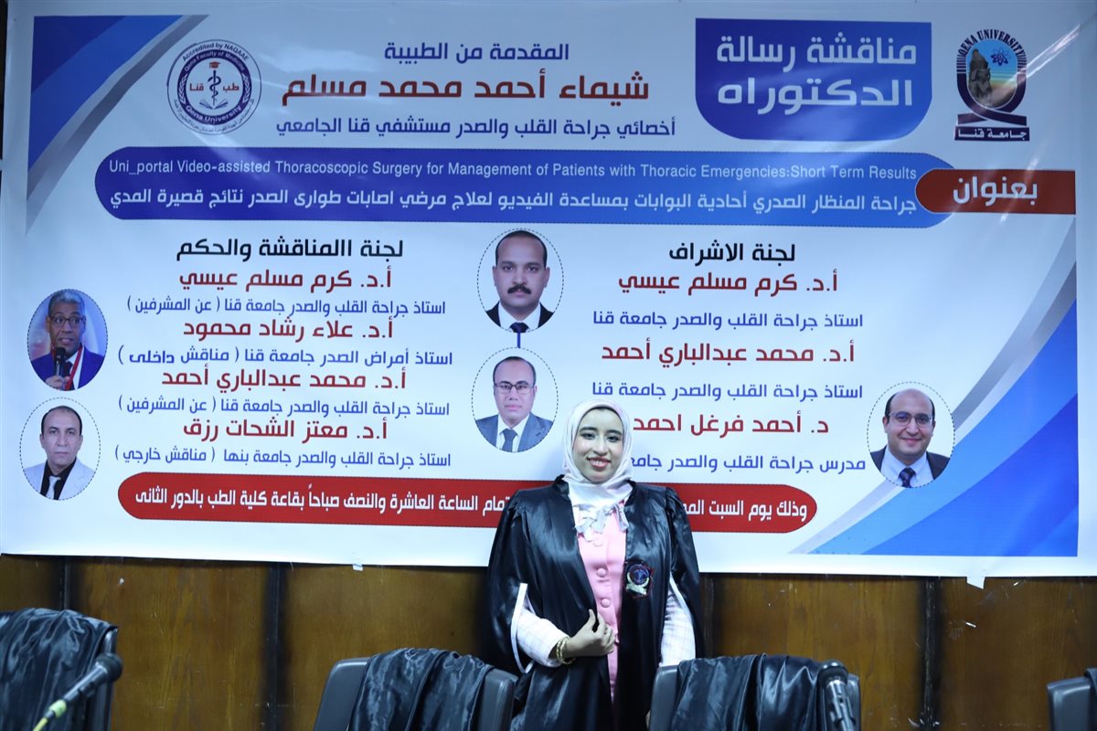 جامعة قنا تناقش رسالة دكتوراه للباحثة شيماء مسلم حول جراحة منظار الصدر