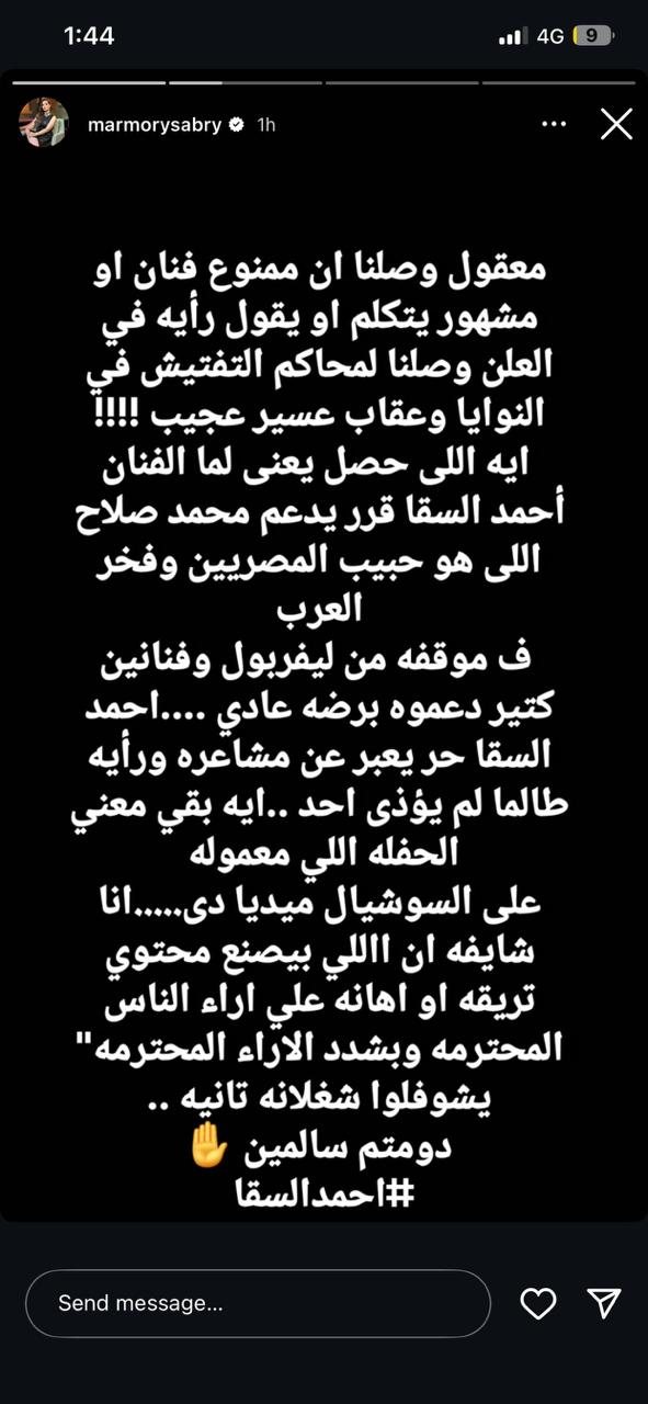 وكتبت مروة صبري عبر خاصية «الاستوري» على حسابها الرسمي بموقع تبادل الصور والفيديوهات «إنستجرام»، معبرة عن استيائها من الهجوم، قائلة: «معقول وصلنا إن ممنوع فنان أو مشهور يتكلم أو يقول رأيه في العلن؟ وصلنا لمحاكم التفتيش في النوايا وعقاب عسير عجيب!».
