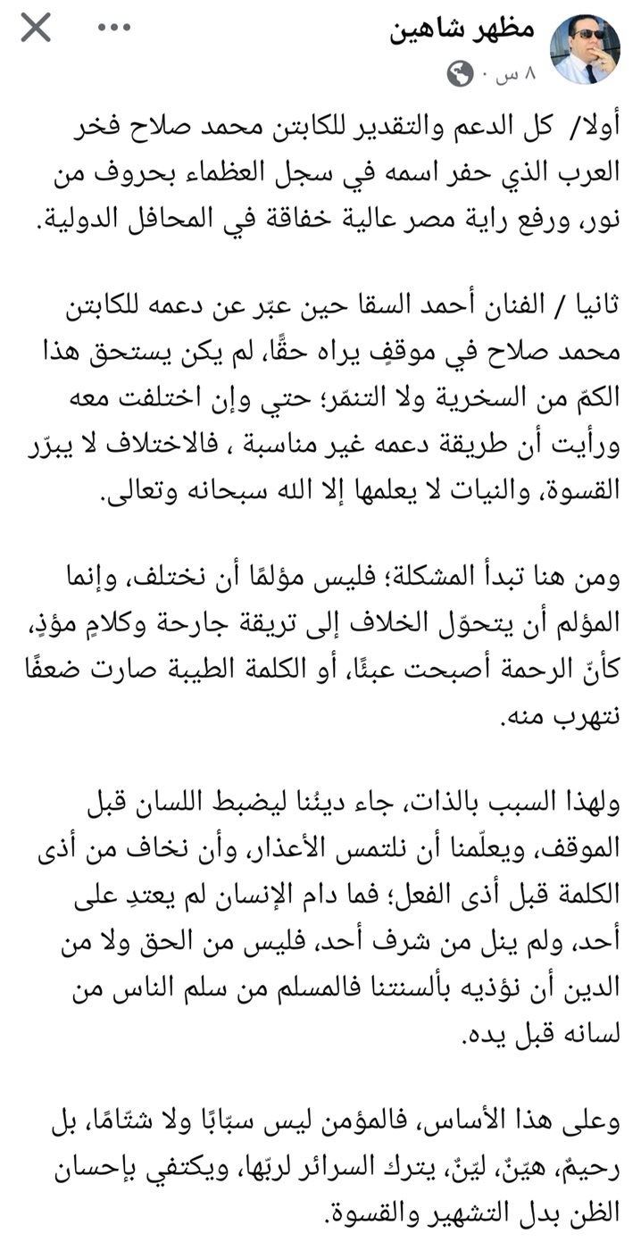 وقال مظهر شاهين، في منشور له عبر حسابه على موقع التواصل الاجتماعي «فيس بوك»، إن محمد صلاح حفر اسمه في سجل العظماء ورفع راية مصر عالية في المحافل الدولية، مؤكدًا أن الفنان أحمد السقا عبّر عن دعمه لما يراه حقًا، ولم يكن يستحق هذا الكم من السخرية، حتى مع اختلاف البعض مع طريقة دعمه.