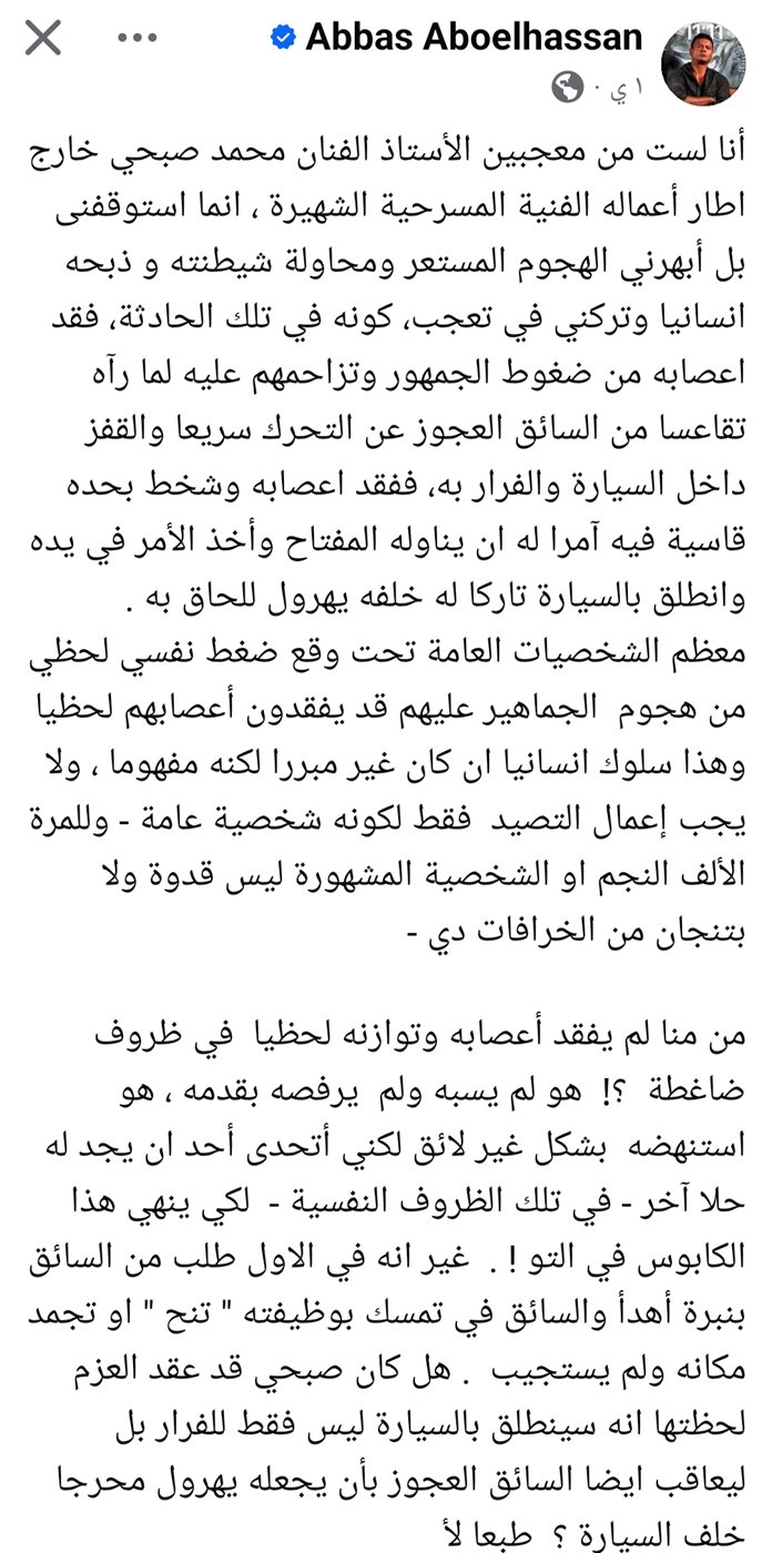 وقال عباس أبو الحسن، في منشور له عبر حسابه الرسمي على موقع التواصل الاجتماعي «فيس بوك»، إنه ليس من معجبي محمد صبحي خارج إطار أعماله المسرحية، إلا أن ما استوقفه هو ما وصفه بمحاولة «شيطنته وذبحه إنسانيًا»، موضحًا أن الواقعة جاءت في لحظة ضغط نفسي شديد نتيجة تزاحم الجمهور عليه، ما أفقده أعصابه عندما رأى تقاعس السائق العجوز عن التحرك سريعًا، فتصرف بحدة لإنهاء الموقف والخروج من هذا «الكابوس» على حد وصفه.