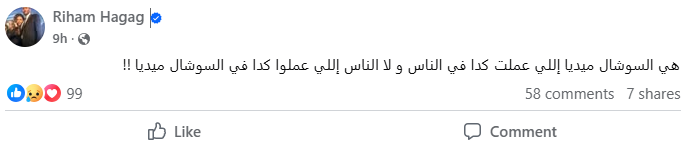وقالت ريهام حجاج عبر منشورها: “هي السوشال ميديا إللي عملت كدا في الناس، ولا الناس إللي عملوا كدا في السوشال ميديا !!”
