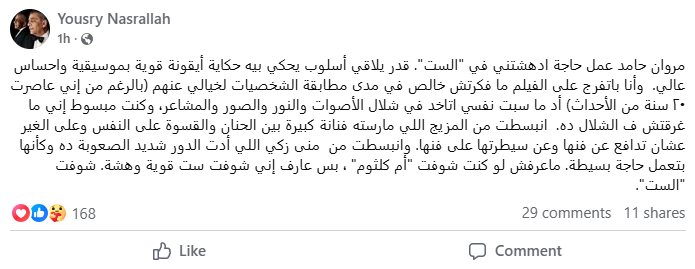وقال يسري نصرالله في منشوره: "مروان حامد عمل حاجة ادهشتني في فيلم الست، قدر يلاقي أسلوب يحكي بيه حكاية أيقونة قوية بموسيقية وإحساس عالي، وأنا بتفرج على الفيلم ما فكرتش خالص في مدى مطابقة الشخصيات لخيالي عنهم بالرغم من إني عاصرت 20 سنة من الأحداث، قد ما سبت نفسي اتاخد في شلال الأصوات والنور والصور والمشاعر، وكنت مبسوط إني ما غرقتش ف الشلال ده، انبسطت من المزيج اللي مارسته فنانة كبيرة بين الحنان والقسوة على النفس وعلى الغير عشان تدافع عن فنها وعن سيطرتها على فنها، وانبسطت من منى زكي اللي أدت الدور شديد الصعوبة ده وكأنها بتعمل حاجة بسيطة، ماعرفش لو كنت شوفت "أم كلثوم"، بس عارف إني شوفت ست قوية وهشة، شوفت الست."