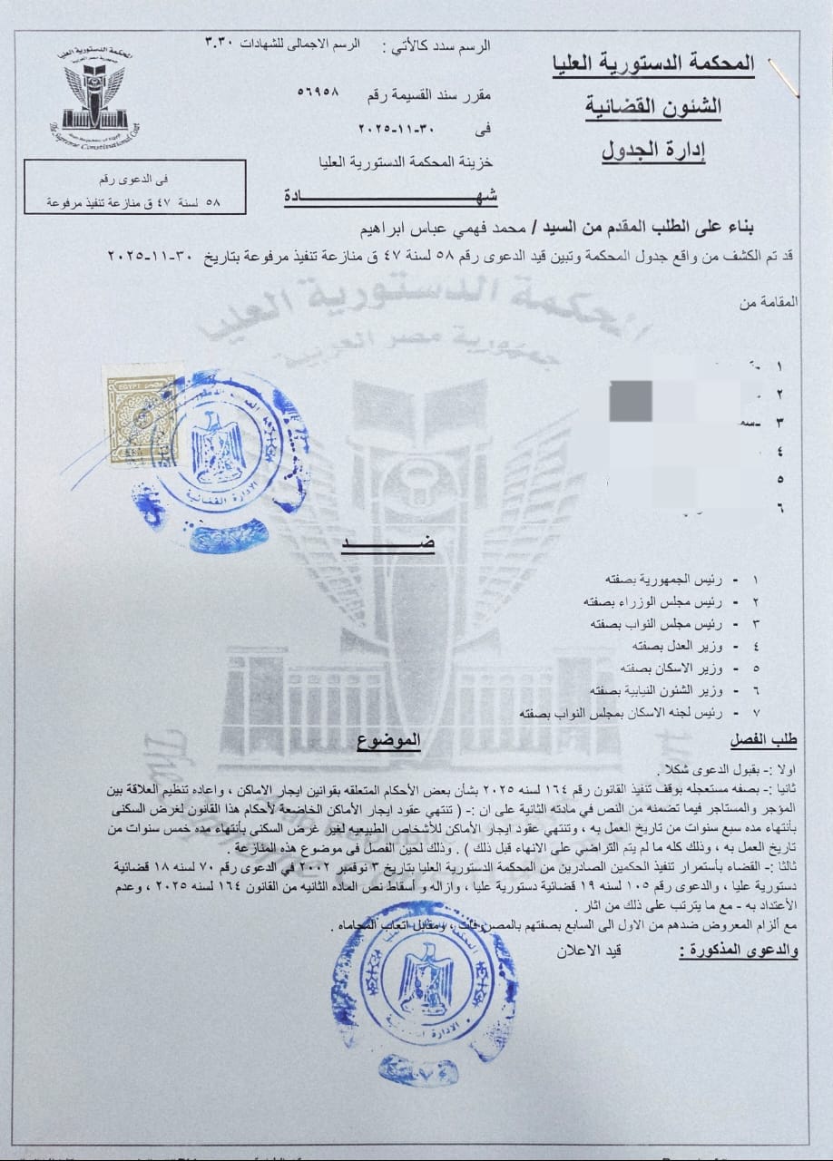 ونشر موقع “نيوز رووم” مؤخرًا، أول دعوى موضوعية باسم اتحاد المستأجرين للطعن على عدد من قانون الإيجار القديم رقم 164 لسنة 2025.