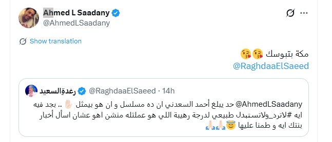 وكتبت رغدة السعيد، في تغريدة عبر حسابها الرسمي على منصة «إكس»: «حد يبلغ أحمد السعدني إن ده فيلم وإن هو بيمثل.. بجد في إيه: لا ترد ولا تستبدل.. طبيعي لدرجة رهيبة، اللي هو عملتله منشن أهو عشان أسأل أخبار بنتك إيه وطمنا عليها».