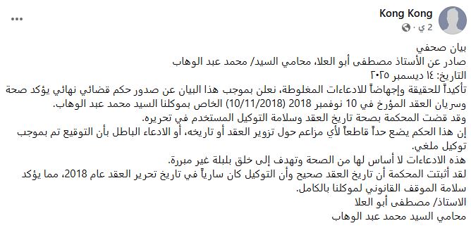 وقال محمد عبدالوهاب في البيان: “بيان صحفي صادر عن الأستاذ مصطفى أبو العلا، محامي السيد/ محمد عبد الوهاب، تأكيداً للحقيقة وإجهاضاً للادعاءات المغلوطة، نعلن بموجب هذا البيان عن صدور حكم قضائي نهائي يؤكد صحة وسريان العقد المؤرخ في 10 نوفمبر 2018 (10/11/2018) الخاص بموكلنا السيد محمد عبد الوهاب، وقد قضت المحكمة بصحة تاريخ العقد وسلامة التوكيل المستخدم في تحريره، إن هذا الحكم يضع حداً قاطعاً لأي مزاعم حول تزوير العقد أو تاريخه، أو الادعاء الباطل بأن التوقيع تم بموجب توكيل ملغي، هذه الادعاءات لا أساس لها من الصحة وتهدف إلى خلق بلبلة غير مبررة، لقد أثبتت المحكمة أن تاريخ العقد صحيح وأن التوكيل كان سارياً في تاريخ تحرير العقد عام 2018، مما يؤكد سلامة الموقف القانوني لموكلنا بالكامل”.