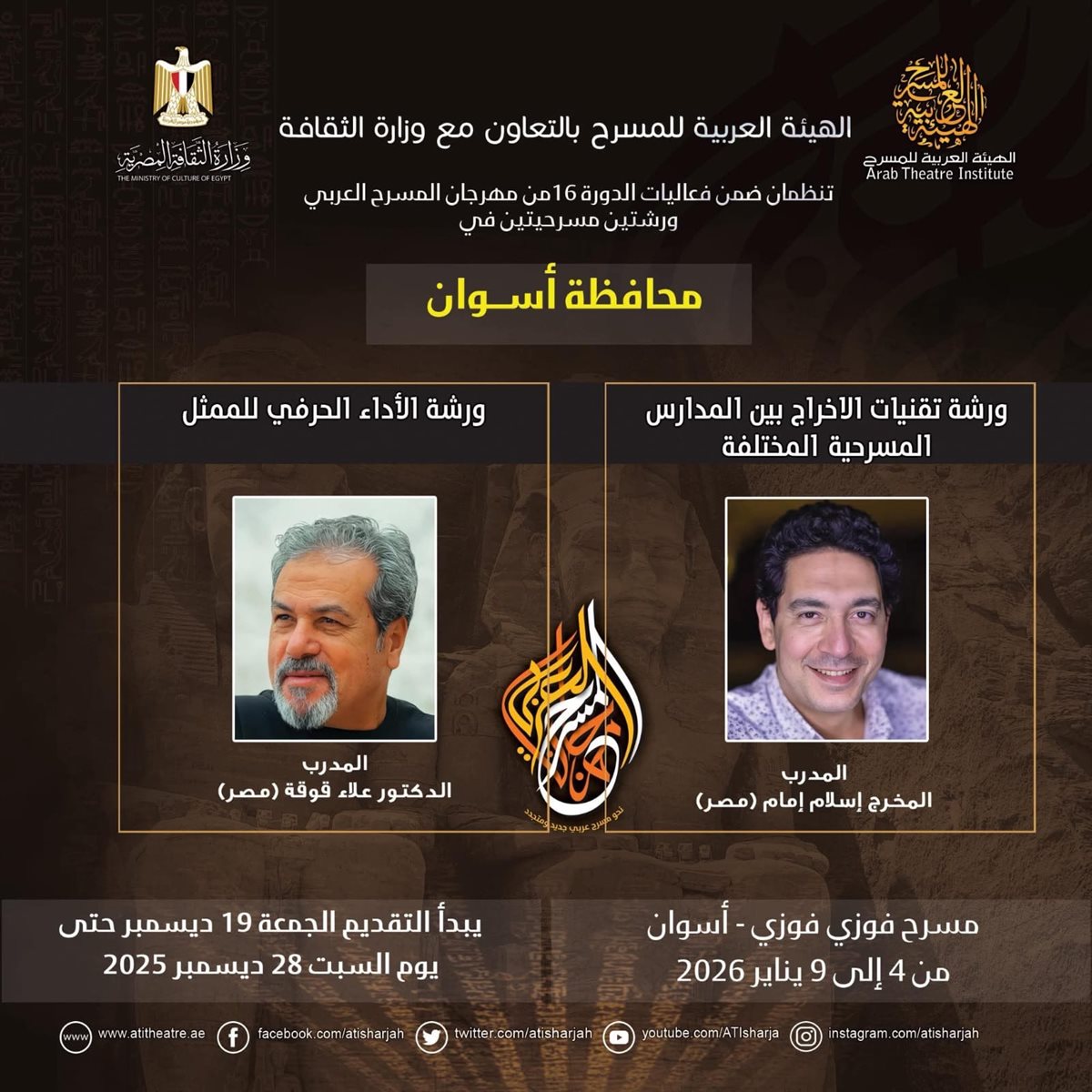 وفي أسوان، تُقام ورشة تمثيل يقدمها الفنان علاء قوقة، إلى جانب ورشة إخراج يشرف عليها المخرج إسلام إمام، بهدف صقل مهارات المشاركين وتنمية أدواتهم الأدائية والإخراجية.