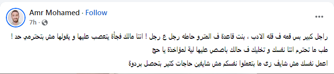 وعلقت أخرى على الواقعة: "الرجل قال لها بهدوء: «مش عيب كده؟»