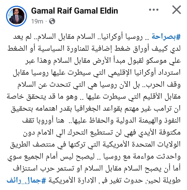 واختتم رائف بقوله: هنا أوروبا تقف مكتوفة الأيدي فهي لن تستطيع التحرك إلى الأمام دون الولايات المتحدة الأمريكية التي تركتها في منتصف الطريق وأحدثت مواءمة مع روسيا، ليصبح الجميع ليس أمامهم إلا أن يصبح السلام مقابل السلام أو تستمر حرب استنزاف طويلة لحين حدوث تغير في الإدارة الأمريكية.