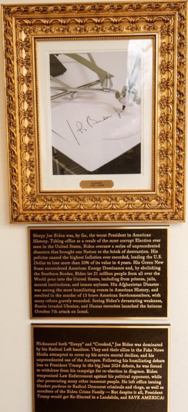 أضاف الرئيس الأمريكي دونالد ترامب لوحات جديدة أسفل كل صورة من صور رؤساء أمريكا الـ 45 على "ممشى المشاهير الرئاسي" في البيت الأبيض، بما في ذلك هجمات لاذعة على أسلافه جو بايدن وباراك أوباما وجورج دبليو بوش.