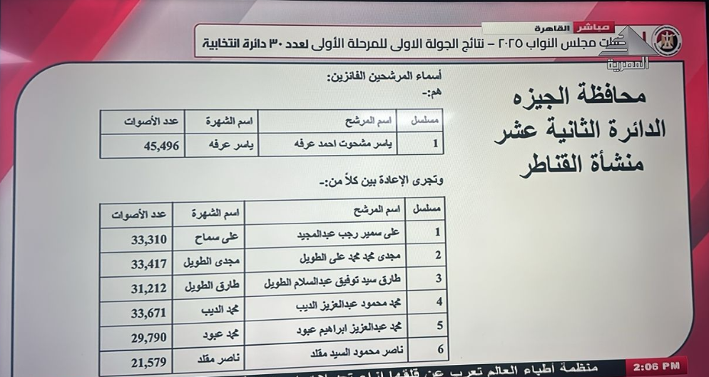 وأكدت الهيئة فوزر المرشح ياسر عرفة لحصولة على 45496 صوت بعضوية مجلس النواب 2025 عن الدائرة الثانية عشر ومقرها منشاة القناطر على أن تجرى الاعادة على المقاعد الثلاثة المتبقية بين كل من المرشح على سماح لحصوله على 33310، و المرشح مجدى الطويل لحصوله على 33417 ، و المرشح طارق الطويل لحصوله على 31312، و المرشح محمد الديب لحصوله على 33671، و المرشح محمد عبود لحصوله على 29790، و المرشح ناصر مقلد لحصوله على 21579.
