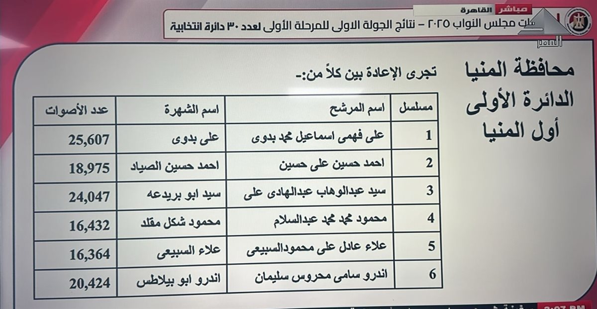 وأكدت الهيئة الإعادة فى الدائرة الأولى بالمنيا ومقرها أول المنيا على عضوية مجلس النواب 2025 بين كل من المرشح على بدوى لحصوله على 25607 والمرشح أحمد حسين الصياد لحصوله على 18975، والمرشح سيد ابو بريدعه لحصوله على 24047 ، والمرشح محمود شكل مقلد لحصوله على 16432 ، والمرشح علاء السبيعى لحصوله على 16364 ، والمرشح أندرو ابو بيلاطس لحصوله على 20424 .