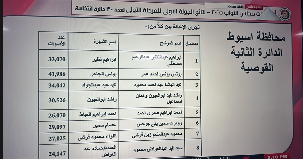 وأكدت الهيئة الإعادة فى الدائرة الثانية بمحافظة أسيوط ومقرها القوصية على عضوية مجلس النواب 2025 بين كل من: :