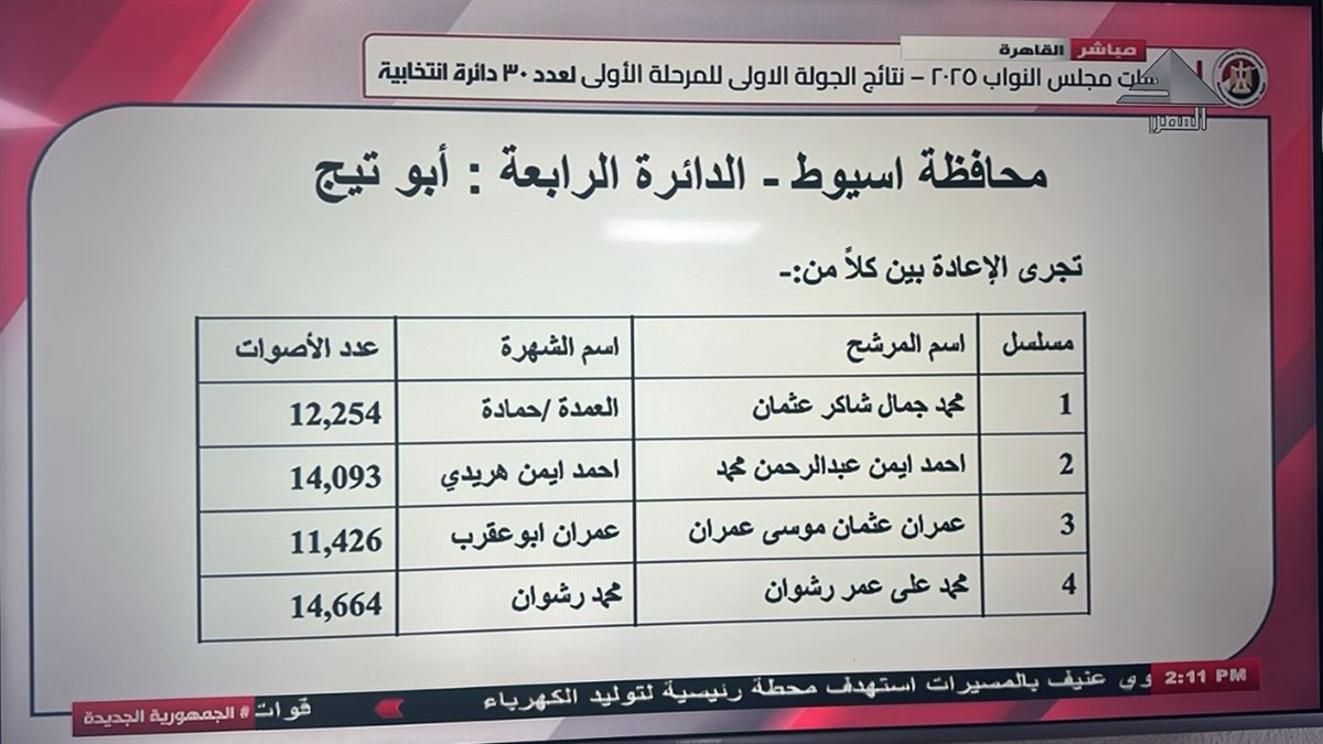 وأكدت الهيئة الإعادة فى الدائرة الرابعة بمحافظة أسيوط ومقرها أبو تيج على عضوية مجلس النواب 2025 بين كل من: :