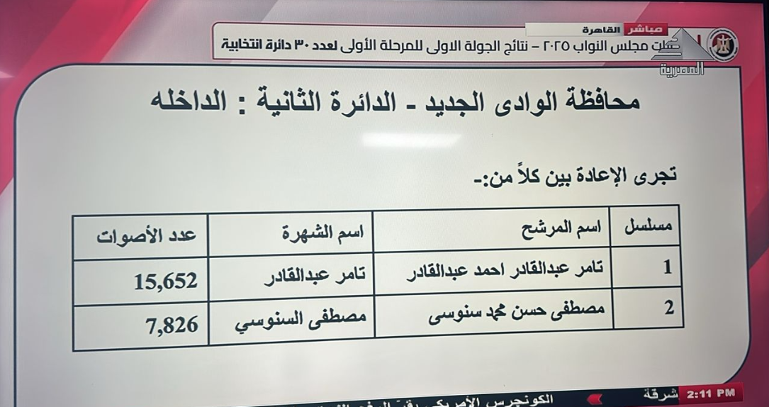 وأكدت الهيئة الإعادة فى الدائرة الثانية بمحافظة الوادى الجديد ومقرها الداخلة على عضوية مجلس النواب 2025 بين كل من: :