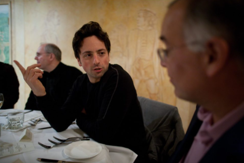 وتُظهر صورة منفصلة، يبدو أنها من الغرفة نفسها، سيرجي برين، المؤسس المشارك لشركة جوجل، وديفيد بروكس، كاتب عمود في صحيفة نيويورك تايمز، والذي يُساهم بانتظام في برنامج "بي بي إس نيوز آور".