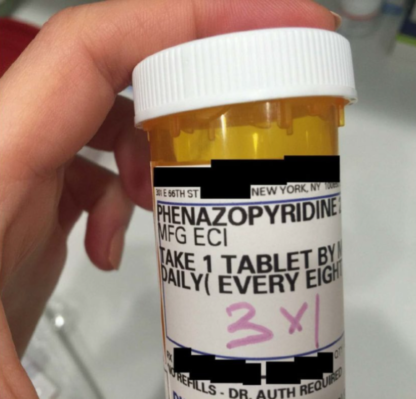 - يد تحمل زجاجة دواء عليها ملصق فينازوبيريدين، وهو مسكن ألم عام يستخدم لتخفيف آلام المسالك البولية والحرقان.