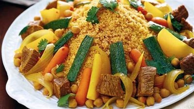 - يُوضع الكسكس في طبق كبير ويُشكل على هيئة جبل.