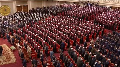 وأستأذن الدكتور أسامة الأزهري الرئيس السيسي أن تقرأ الدفعة المتخرجة وأن نقرأ جميعًا معها سورة الفاتحة قراءة جماعية توثيقًا للعهد والميثاق