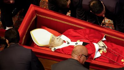 ويتم عرض التابوت أمام مظلة "سان بيدرو" الباروكية المهيبة، وقد وصل إلى مثواه الأخير، الأربعاء، في موكب من دار سانتا مارتا التي توفي فيها، وقد تم عرضه مع مسبحته التي لا تترك يديه، وكاسبول أحمر وحذاء أسود، رمزًا للتقشف.