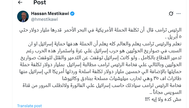 وقال المستكاوي: “علم والرئيس ترامب يعلم والعالم كله يعلم أن الحملة هدفها حماية إسرائيل او ان السبب في صواريخ الحوثيين هو حرب إسرائيل علي غزة واستمرار هذه الحرب رغم تدمير القطاع بالكامل . ولو كانت إسرائيل توقفت عن التدمير والقتل لتوقفت صواريخ الحوثيين وبالتالي علي فخامة الرئيس ترامب مطالبة إسرائيل بمليار دولار تكلفة حملة حمايتها بالإضافة الي خمسين مليار دولار تكلفة اسلحة وردتها أمريكا الي إسرائيل منها طائرات اف ٣٥ وهي تحارب ميليشيات مسلحة ببنادق وكاتيوشا”.