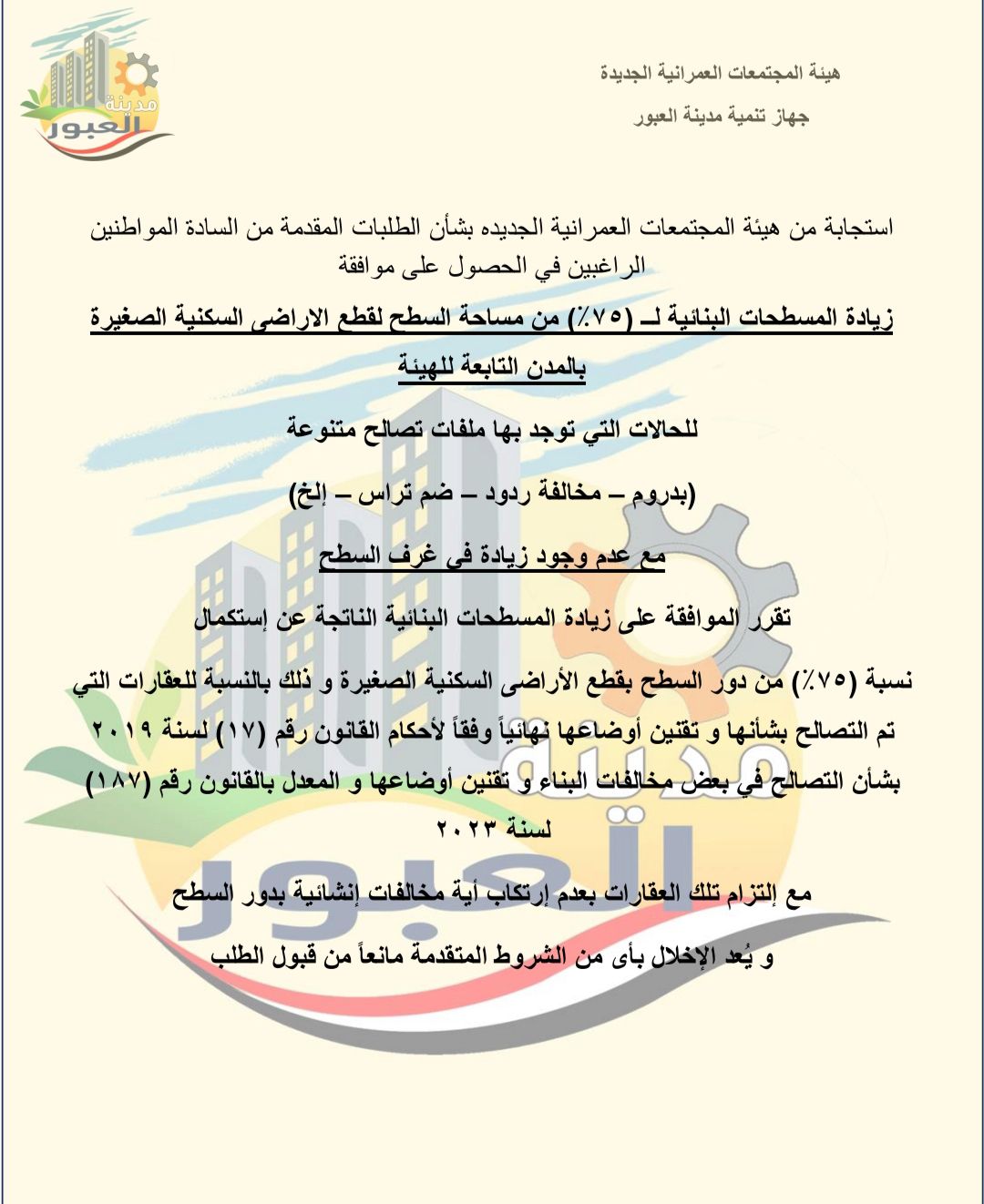جاءت هذه الاستجابة بعد مطالبات عديدة من المواطنين الراغبين في زيادة المسطحات البنائية، وخاصة للحالات التي أتمت إجراءات التصالح وتقنين أوضاعها.