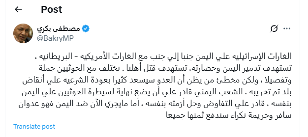 وقال بكري ، فى تغريديته: “ الغارات الإسرائيلية علي اليمن جنبا إلي جنب مع الغارات الأمريكية - البريطانية، تستهدف تدمير اليمن وحضارته ، تستهدف قتل أهلنا نختلف مع الحوثيين جملة وتفصيلا ، ولكن مخطئ من يظن أن العدو سيسعد كثيرا بعودة الشرعيه علي أنقاض بلد تم تخريبه . الشعب اليمني قادر علي أن يضع نهاية لسيطرة الحوثيين علي اليمن بنفسه ، قادر علي التفاوض وحل أزمته بنفسه ، أما مايجري الآن ضد اليمن فهو عدوان سافر وجريمة نكراء سندفع ثمنها جميعا”.