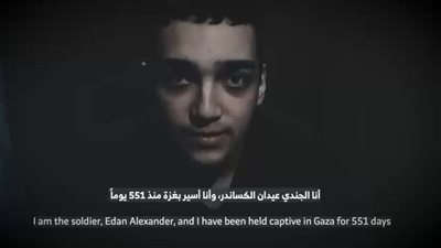 نشرت حركة حماس تسجيلًا مصورًا جديدًا يظهر فيه عيدان ألكسندر، الجندي الأمريكي-الإسرائيلي المحتجز في قطاع غزة منذ 554 يومًا، في محاولة جديدة لما وصفته مصادر إسرائيلية بـ"الحرب النفسية" التي تنتهجها الحركة ضد الرأي العام الإسرائيلي وعائلات الأسرى.