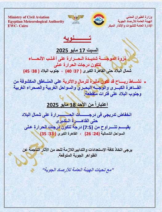 اقرأ أيضًا ..الأرصاد: موجة شديدة الحرارة تصل لـ 45 درجة تبدأ غدًا الجمعة