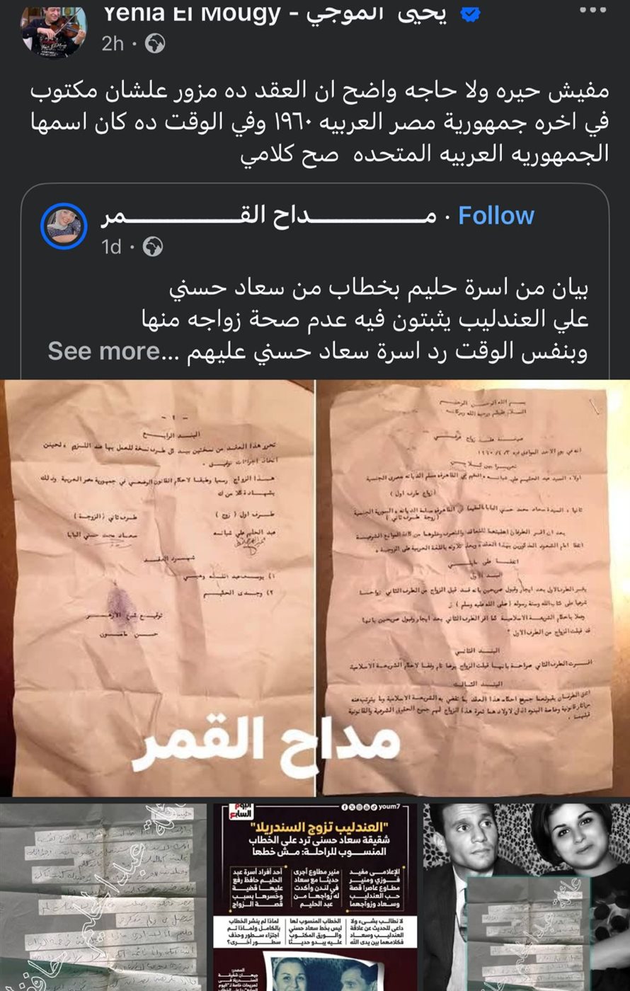 كشف الموسيقار يحيى الموجي حقيقة زواج الفنان الراحل عبد الحليم حافظ من سندريلا الشاشة العربية سعاد حسني، حيث نشر عقد الزواج العُرفي، الذي نشرته أسرة الراحلة سعاد حسني عبر حسابه الرسمي على موقع التواصل الإجتماعي فيسبوك، وعلق عليه قائلًا: “مفيش حيرة ولا حاجة .. واضح أن العقد ده مزور .. علشان مكتوب في اخره جمهورية مصر العربية .. عام 1960 .. وفي الوقت ده كان اسمها الجمهورية العربية المتحدة .. صح كلامي”.