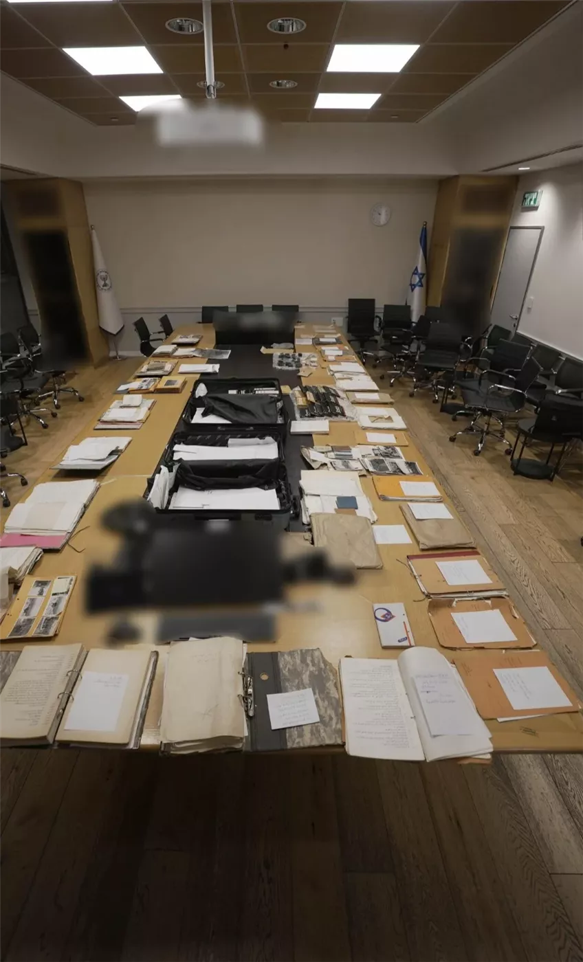 وتُظهر إحدى الصور قاعة مغلقة في مقر أمني إسرائيلي، وُضعت فيها عشرات الملفات والمجلدات الأصلية على طاولة اجتماعات، بينما ظهرت في وسطها حقيبة سوداء مفتوحة، يبدو أنها استُخدمت لنقل الوثائق والمقتنيات، ما يعزز الرواية بأن التهريب جرى ميدانيًا وبوسائل ميدانية محكمة.