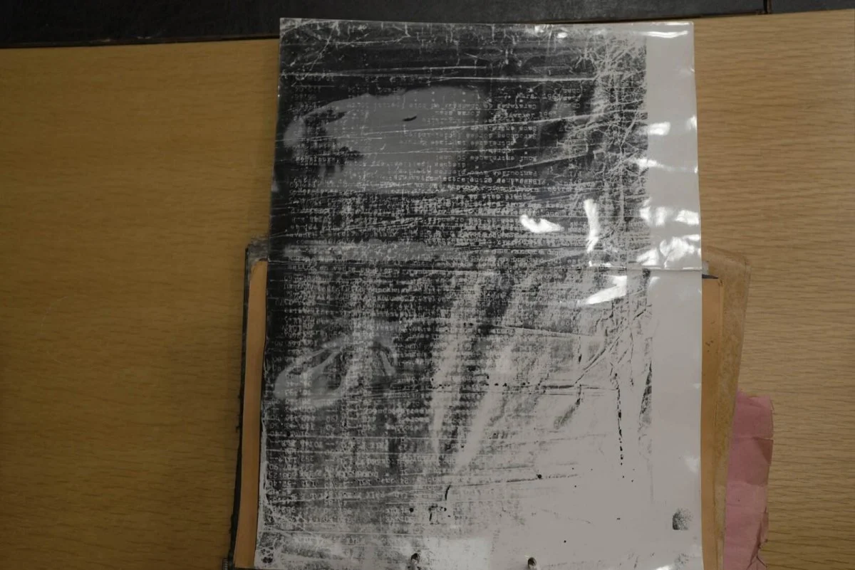 الصورة الثالثة تظهر ورقة مطبوعة متآكلة ومحفوظة داخل غلاف بلاستيكي، ما يدل على أن بعض المواد المهربة كانت بحالة سيئة وتحتاج إلى معالجة أرشيفية بعد تهريبها. ويُفهم من ذلك أن العملية لم تتم عبر رقمنة البيانات، بل بنقل فعلي لمستندات مادية أصلية.