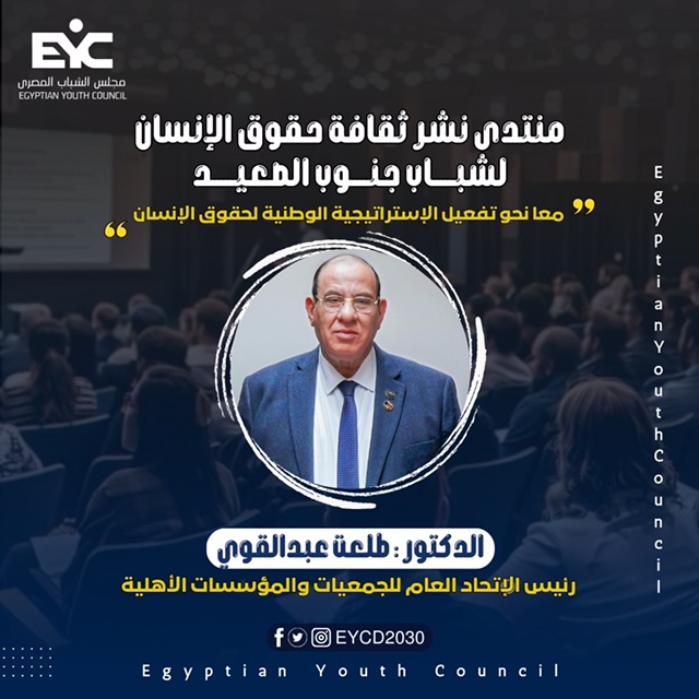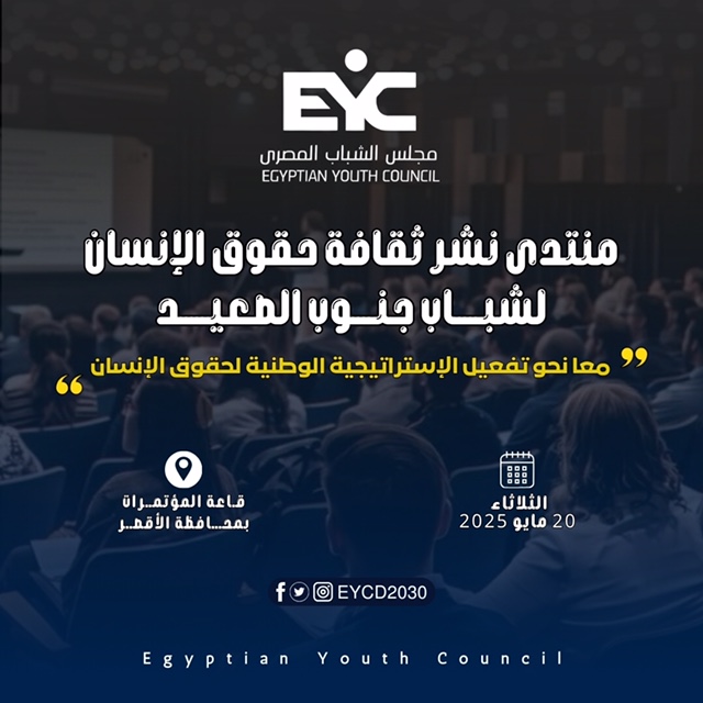 تحت شعار "نحو وعي شبابي فاعل بحقوق الإنسان"، تنطلق اليوم، فعاليات منتدى نشر ثقافة حقوق الإنسان لشباب جنوب الصعيد بمحافظة الأقصر، والذي ينظمه مجلس الشباب المصري بالتعاون مع المجلس القومي لحقوق الإنسان، والاتحاد العام للجمعيات والمؤسسات الأهلية، ونقابة الإعلاميين. وذلك في إطار جهود الدولة والمجتمع المدني لتنفيذ الاستراتيجية الوطنية لحقوق الإنسان، ونشر الثقافة الحقوقية وتعزيز قيم المواطنة والمساواة في صعيد مصر.