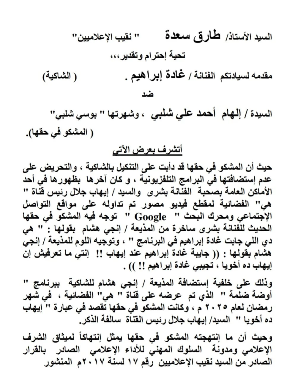 قام المستشار عمرو عبد السلام محامي الفنانة غادة إبراهيم بتقديم شكوى رسمية إلى نقابة الإعلاميين التي يرأسها الدكتور طارق سعدة، نقيب الإعلاميين وعضو مجلس الشيوخ، وذلك بسبب محتوى الفيديو المتداول على مواقع التواصل الاجتماعي وعلى اليوتيوب، الذي وصفته بأنه يحتوي على تهديد واضح وترويع شديد من المذيعة إلهام أحمد علي شلبي الشهيرة بـ "بوسي شلبي"، وذلك في أحد البرامج التليفزيونية الذي تقدمه الإعلامية إنجي هشام في وجود الفنانة بشرى ورئيس قناة هي إيهاب جلال.