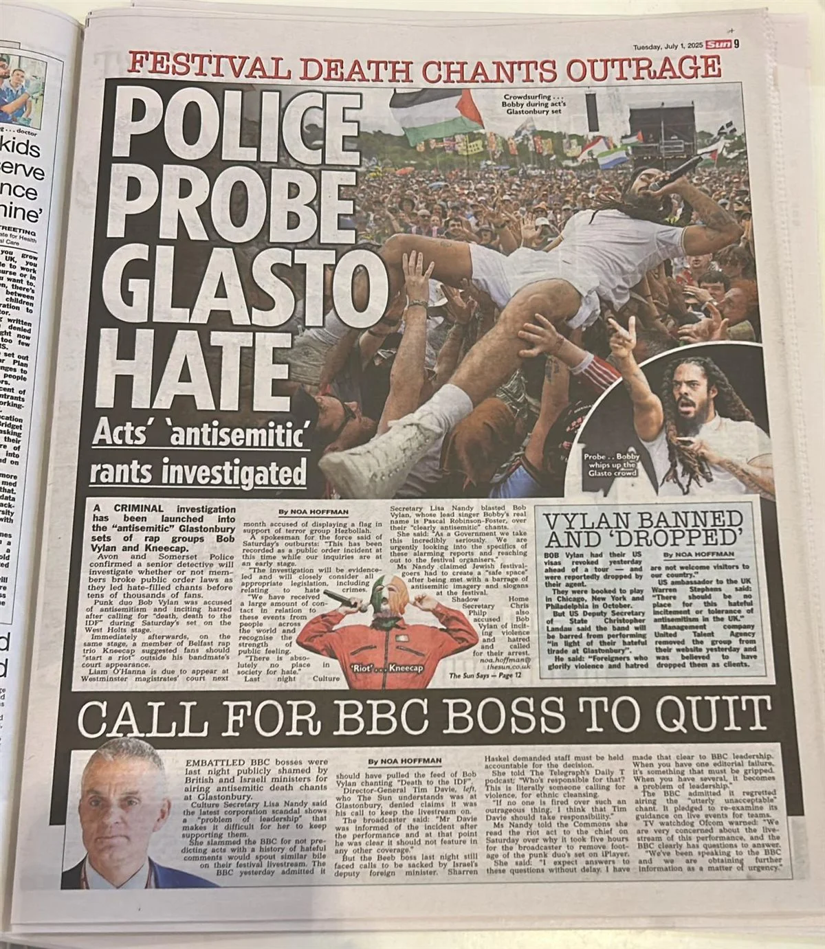 وكان البث المباشر قد نقل لقطات من مهرجان "جلاستنبري" الشهير، شهد خلالها أداءً غنائيًا لفرقة "بوب فايلن" تضمّن هتافات تدعو إلى "الموت لقوات الاحتلال الإسرائيلي"، وهو ما أثار انتقادات واسعة من الأوساط السياسية والإعلامية في بريطانيا، بالإضافة إلى ردود فعل رسمية في الولايات المتحدة.