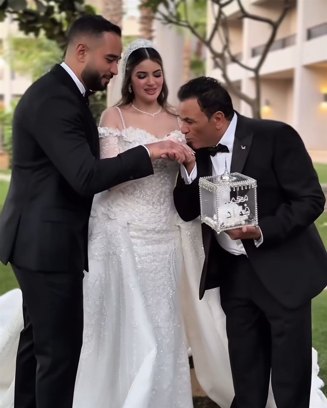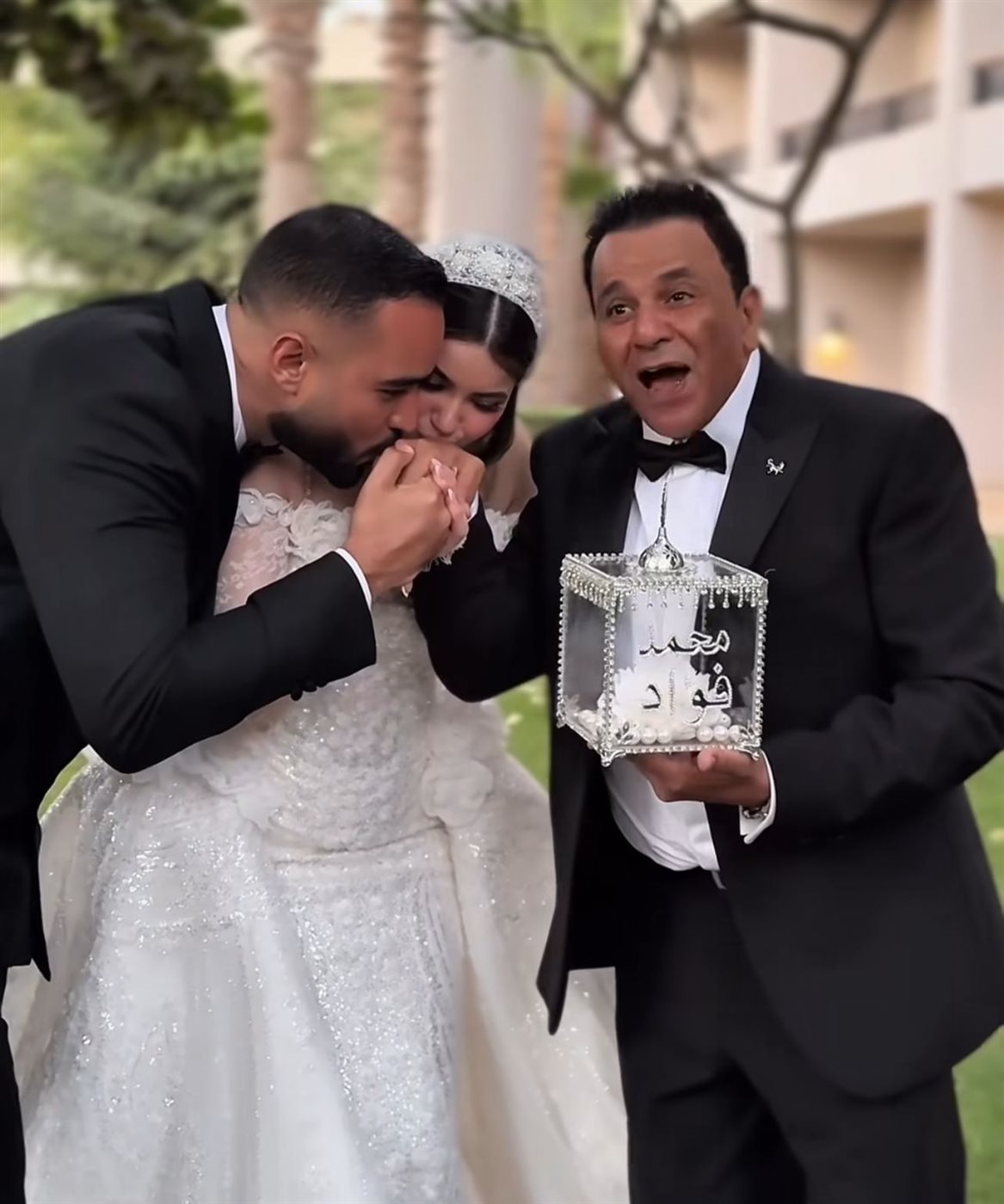 شهد الحفل لحظة عاطفية مؤثرة، حين قام العروسان بسملة ومروان بتقبيل يد الفنان محمد فؤاد تعبيرًا عن الامتنان والحب العميق الذي يجمعهما به، وسط تصفيق الحاضرين ودموع الفرح التي ارتسمت على وجه النجم المعروف برومانسيته وتعلقه بعائلته.